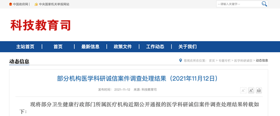 2021年6月,国家卫健委在官网开设了《医学科研诚信专栏》,对各级卫生健康行政部门所属医疗卫生机构、医学科研机构按照《医学科研诚信案件调查处理规则(试行)》查实并公开通报的科研诚信案件调查处理结果予以转载通报。