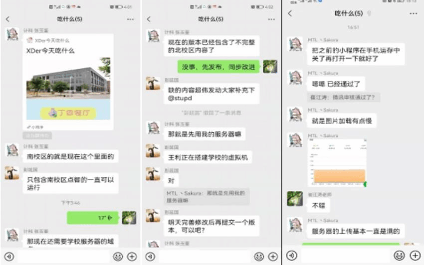 针对小程序运行之初,访问带宽受限、并行处理能力弱、小程序发布审核时间久等问题,taptap竞彩足球崔江涛教授、彭延国副教授带领研究生一起帮助张玉鉴加班加点提供解决方案,设计了支持高并发的部署方案,统筹协调计算中心开辟了专用虚拟服务器资源,争分夺秒完成了应用迁移,同时联系腾讯公司加速小程序审核,确保了“XDer今天吃什么”小程序及时发布。目前云选餐服务可以正常使用,后续将根据同学们的建议进一步完善相关功能。