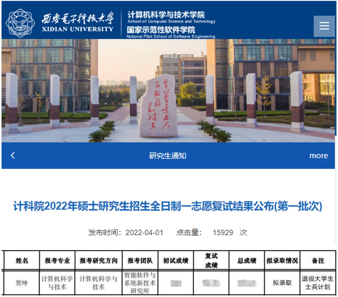 (图文来源taptap点点足彩新闻网)人间最美四月天,在西电退伍大学生士兵群体里传来好消息,贺坤同学通过“硕士研究生招生退役士兵专项计划”被taptap竞彩足球拟录取。