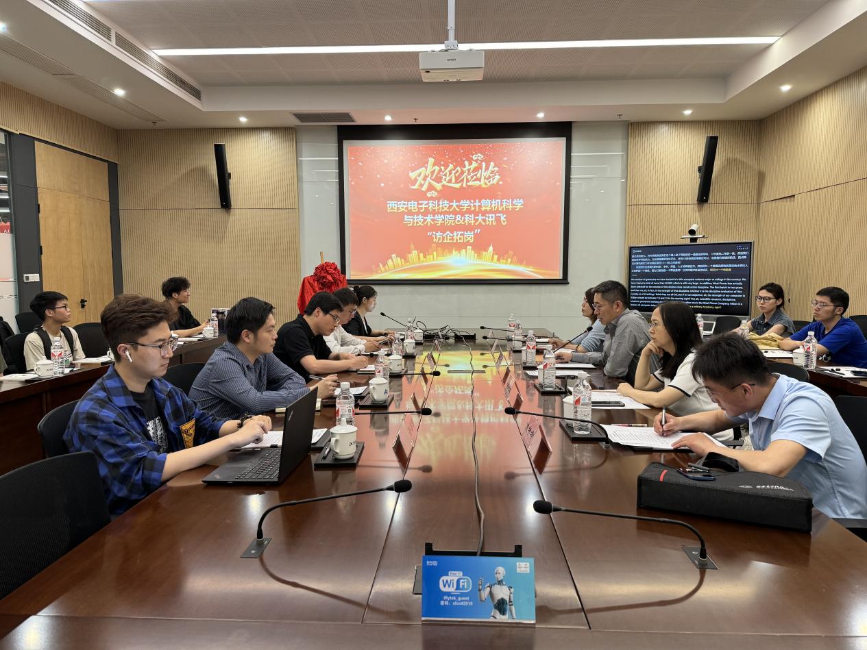 参观结束后,双方就深化校企合作,协同加强科研攻关、智能教育、就业育人等进行座谈交流。科大讯飞西安研究院副院长来意哲对taptap竞彩足球师生一行的到访交流表示热烈的欢迎。崔江涛就学院历史沿革、专业设置、学科建设、科研师资、人才培养优势等方面做了简要介绍。他表示,科大讯飞作为高校科研成果转化的企业典范,在人工智能和计算机领域都有着卓越的成绩和贡献。学院高度重视产学研融合发展,一直持续深化与对口企业的科研联合攻关,希望下一步与科大讯飞在重大科研项目、创新人才培养等方面建立深度合作。双方还就下一步开展在AI+教育领域的合作进行了深入交流。