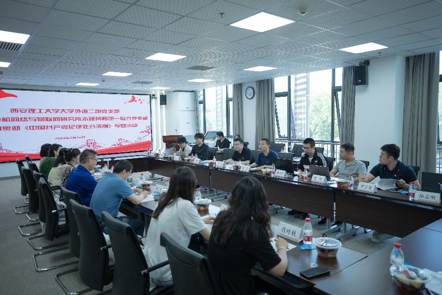 西安理工大学外语二部支部书记宋雨晨和计算机网络与物联网研究所本硕博师第一联合党支部副书记程珂分别领学了《条例》具体内容。宋雨晨首先介绍了《条例》的背景和主要内容,强调了纪律的严肃性和执行的必要性,并对支部前期学习情况进行了分享。程珂介绍了支部学习《条例》的整体安排和计划,领学了《条例》第二编第六章“对违反政治纪律行为的处分”部分,介绍了支部师生党员学纪、守纪、维纪的具体实践。在交流《条例》学习心得环节,师生党员积极发言,表示将严格遵守《条例》,严格执行和维护党的纪律、自觉将纪律要求内化于心、外化于行,在学习工作中学深悟透、学以致用。