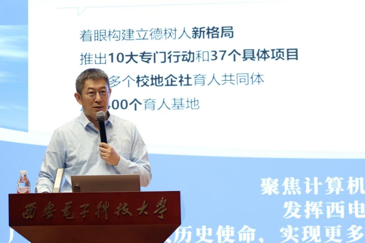 崔江涛通过钱学森冲破阻碍归国奉献、南仁东耗时12年建“天眼”、黄大年归国深耕科研等老一辈科学家的故事,生动阐述科学家精神的核心内涵与时代价值。他讲到,taptap点点足彩延续着中国高校最长的红色根脉,老一辈计算机人更是在“无专业课老师、无专业实验设备、无训练计划”的条件下,为我国重大战略任务做出卓越贡献,一代又一代西电人、计科学子,始终以爱国主义为底色,发扬科学家精神,前赴后继、接续奋斗。