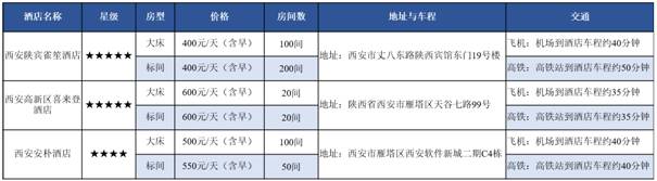 本次大会所推荐酒店,陕西宾馆雀笙酒店与安朴酒店都将由会务组提供酒店至会场的摆渡车服务,陕西宾馆雀笙酒店距离本次会议的举办地西安高新国际会议中心约15分钟车程,安朴酒店距离西安高新国际会议中心约5分钟车程。西安高新区喜来登酒店距离西安高新国际会议中心步行约10分钟。酒店预订链接:http://kaili.kailimice.cn/f/WuTdwF