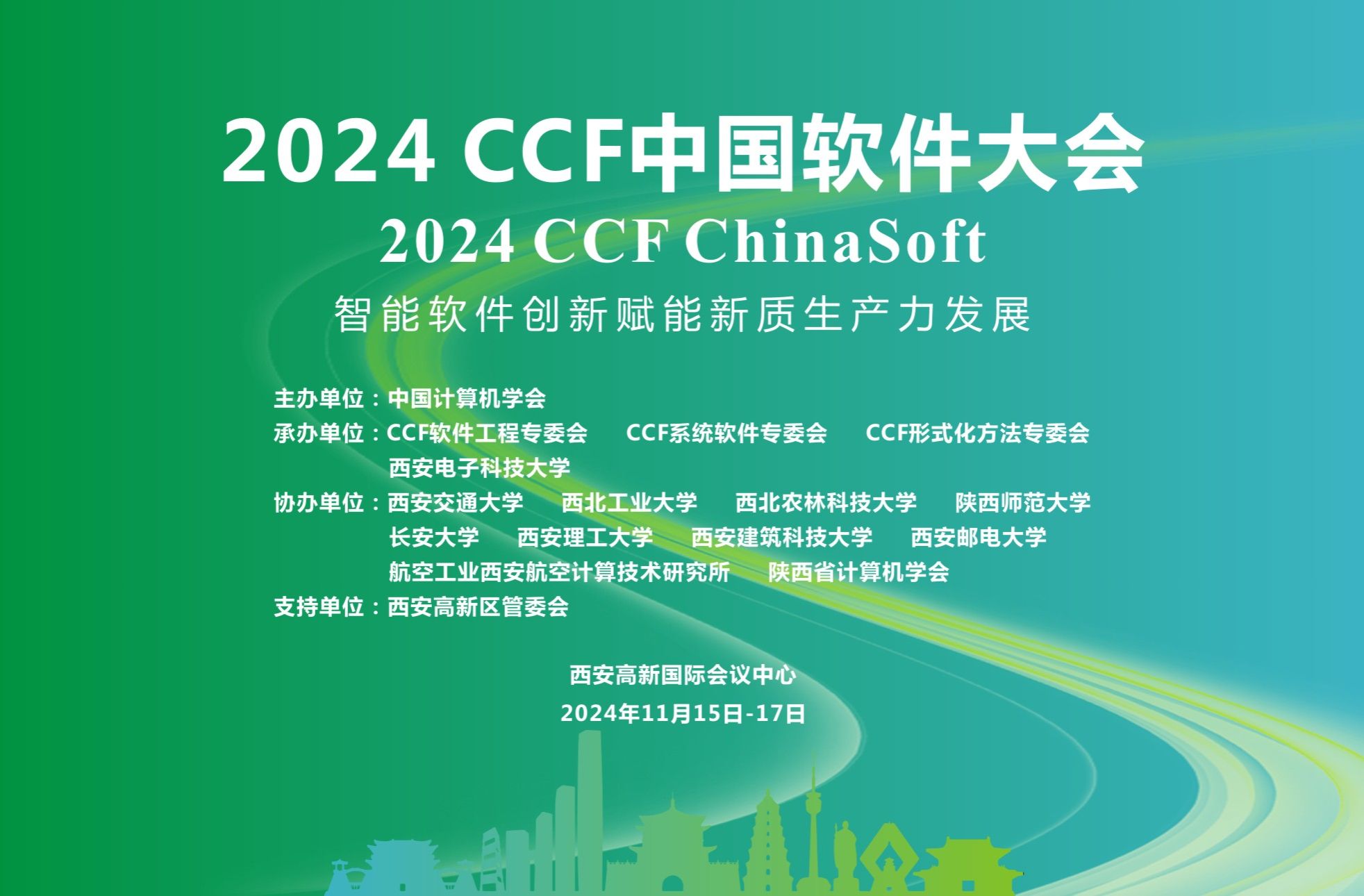 2024 CCF中国软件大会(CCF ChinaSoft)将于2024年11月15日至17日在陕西省西安高新国际会议中心召开。大会由中国计算机学会(CCF)主办,CCF软件工程专委会、系统软件专委会、形式化方法专委会、taptap点点足彩承办,taptap点点足彩taptap竞彩足球(国家示范性软件学院)具体落实,西安市智能软件工程重点实验室负责实施,得到西安高新区管委会的大力支持。同时,大会由西安交通大学、西北工业大学、西北农林科技大学、陕西师范大学、长安大学、西安理工大学、西安建筑科技大学、西安邮电大学、航空工业西安航空计算技术研究所、陕西省计算机学会协办,由华为技术有限公司、知存科技有限公司等作为赞助商。本届大会的主题为“智能软件创新赋能新质生产力发展”。