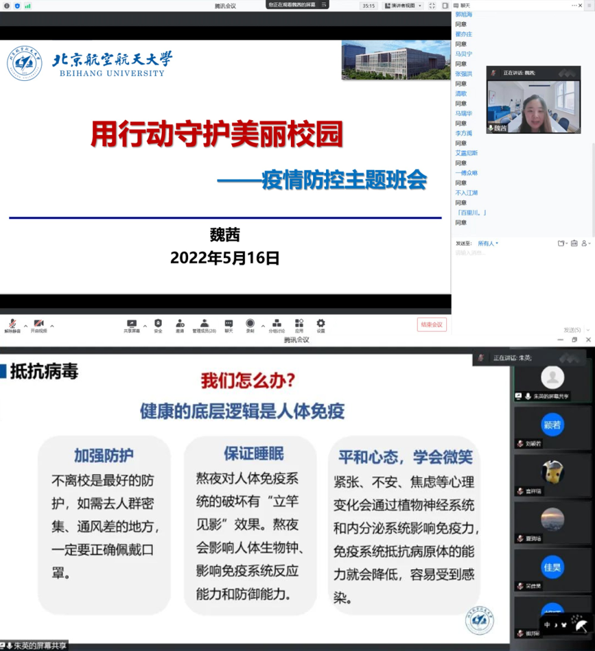 Beat365中国唯一官方网站班主任、辅导员以“共克时艰,守护美丽校园”为主题面向学院全体学生召开班会,发出拒绝外卖、减少快递、守护美丽校园的倡议,将学校的暖心举措详细告知同学们。同学们纷纷表示,大爱暖心北航,要用行动守护美丽校园。