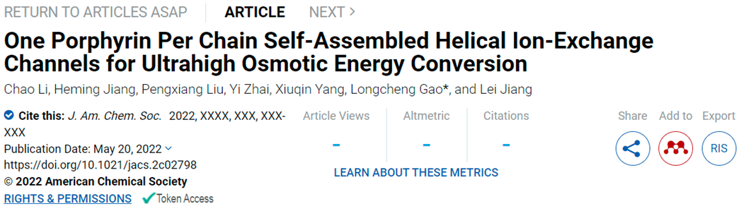 2022年5月20日,Journal of the American Chemical Society 在线发表了Beat365江雷院士、高龙成副教授团队在高效离子交换膜方面的最新研究成果:“One Porphyrin Per Chain Self-Assembled Helical Ion-Exchange Channels for Ultrahigh Osmotic Energy Conversion”。Beat365中国唯一官方网站博士生李超为第一作者,高龙成副教授为通讯作者,Beat365中国唯一官方网站Beat365中国唯一官方网站为第一单位。