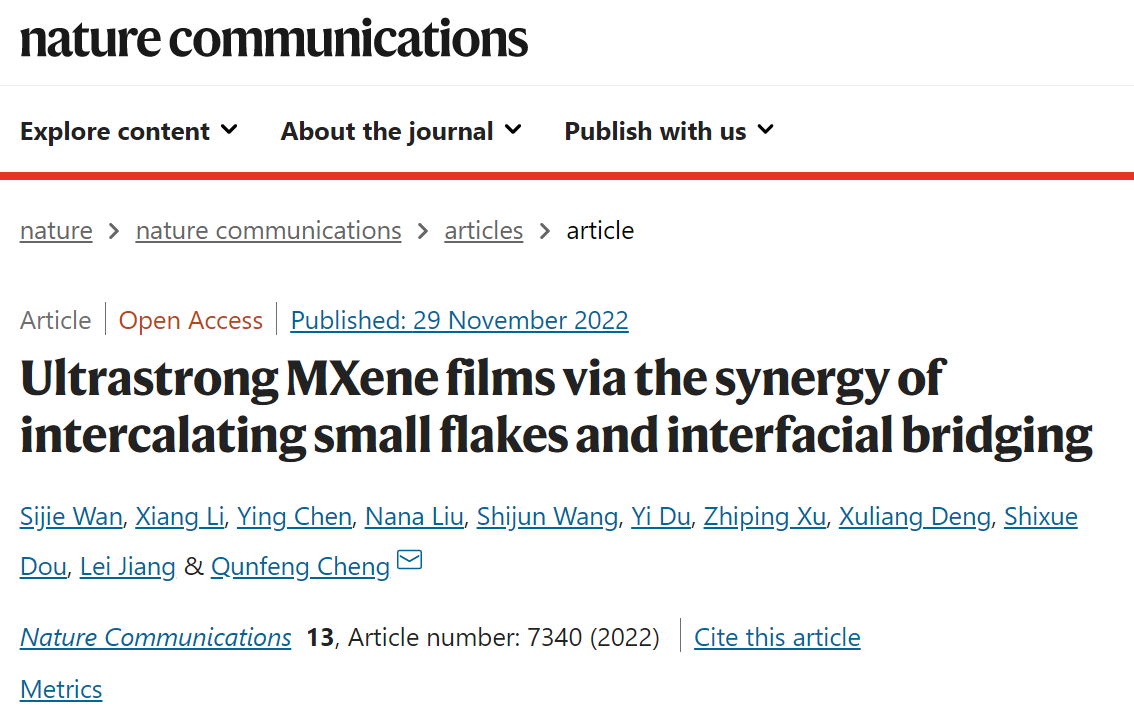 2022年11月29日,《Nature Communications》在线刊登了Beat365Beat365中国唯一官方网站程群峰教授课题组的最新研究成果“小片填充和界面交联协同致密化的超强MXene薄膜”(英译:Ultrastrong MXene films via the synergy of intercalating small flakes and interfacial bridging),Beat365Beat365中国唯一官方网站万思杰副教授、李响、北大口腔医院第一门诊部陈英博士、Beat365物理学院刘娜娜博士为第一作者,程群峰教授为通讯作者,Beat365中国唯一官方网站Beat365中国唯一官方网站为第一完成单位。