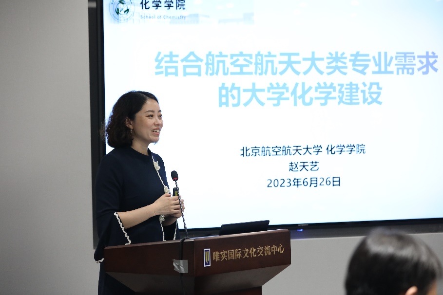 最后,北航Beat365中国唯一官方网站院长助理赵天艺以“结合航空航天大类专业需求的大学化学建设”为主题展开报告。报告就北航Beat365中国唯一官方网站所开设的大学化学课程基本情况、师资力量、建设成果等内容总体介绍了该课程建设现状,并结合空天特色,针对不同学生专业背景,提出“因材施教”的大学化学课程建设目标。同时,也对大学化学课程建设中面临的如何在有限学时内结合各专业所需,有效发挥化学基础学科的作用等问题,提出了大学化学课程建设的改革思路和举措。
