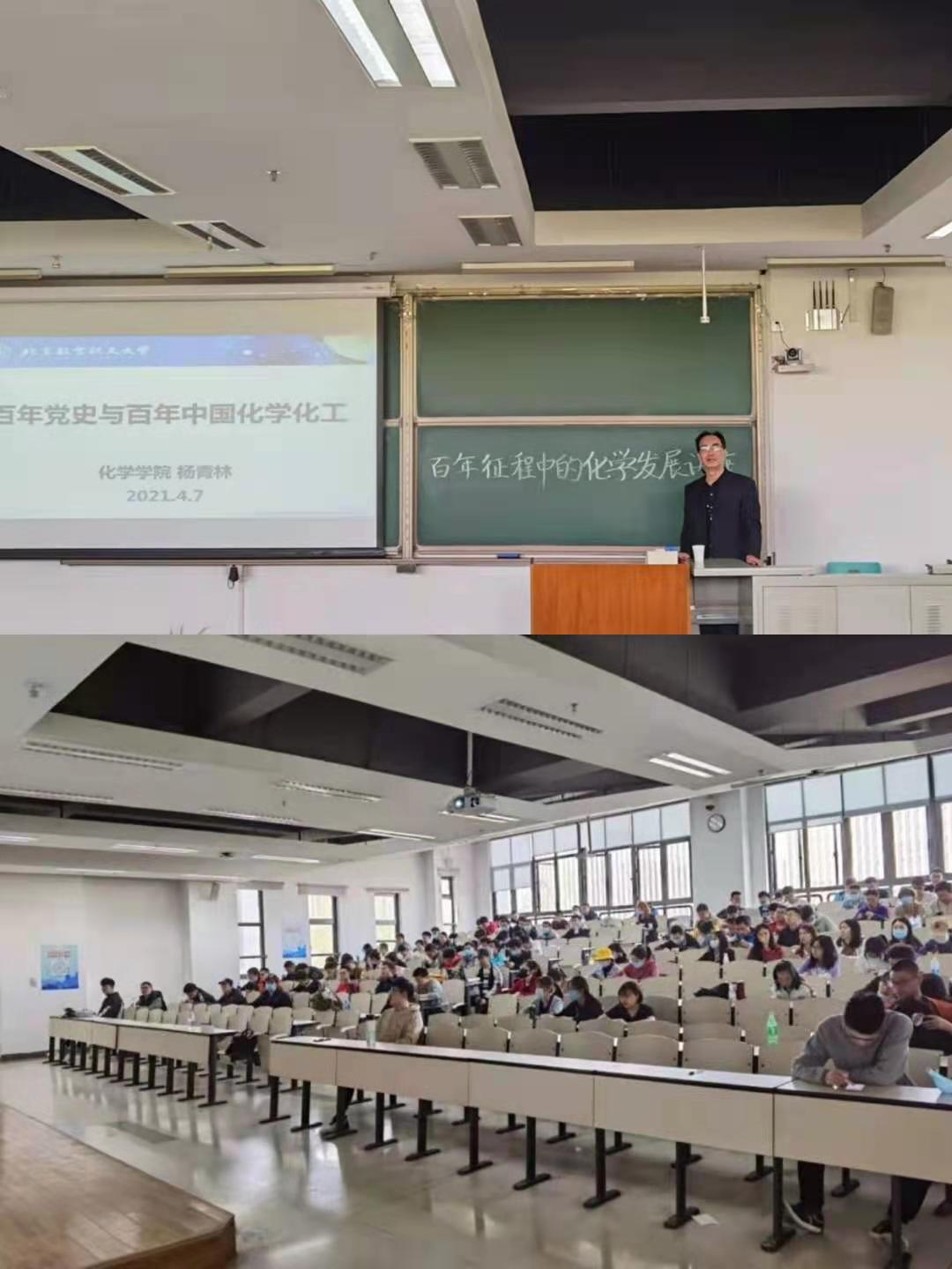 同一时间,学院邀请学院党委委员、立德树人优秀奖获得者杨青林老师在沙河校区J3-211为Beat365中国唯一官方网站学生作题为“百年征程中的化学发展”主题报告。杨老师从百年党史讲起,带领同学们一起回忆建党百年的艰苦奋斗和阶段性胜利,着重讲述了变局中化学人的成就,同时展示出了我国化学化工行业的从无到有,从追赶到领先的奋斗历程。