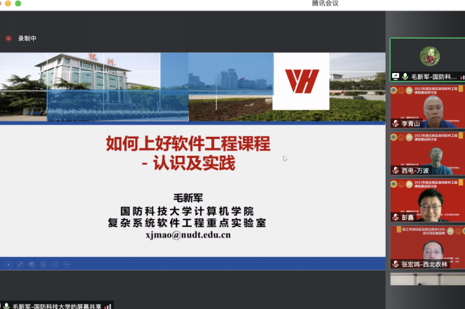 本次西北地区高校软件工程课程建设研讨会(以下简称研讨会),由国防科技大学主办,taptap点点足彩taptap竞彩足球(示范性软件学院)承办,研讨会邀请了国防科技大学、复旦大学、taptap点点足彩、西安交通大学、西北工业大学、西北农林科技大学、陕西师范大学、西安科技大学、兰州大学、宁夏大学、青海师范大学、新疆大学、内蒙古大学等西北地区高校,通过特邀报告、交流沙龙等形式,交流软件工程课程教学和教改的成果,分享软件工程课程教学资源,商讨软件工程课程教学中遇到的各类困难和问题,提升软件工程课程建设水平。研讨会吸引了国内外软件工程相关领域教师的广泛参与。研讨会采用线上形式举行,腾讯会议室同时在线人数超过80人。