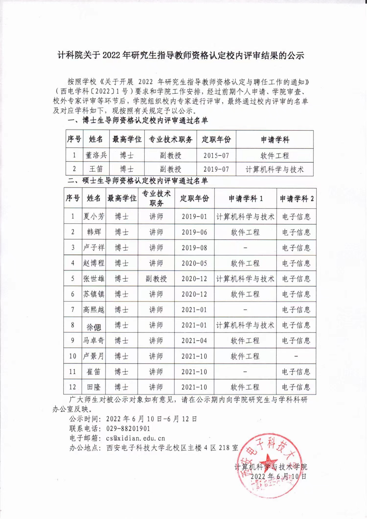 计科院关于2022年研究生指导教师资格认定校内评审结果的公示