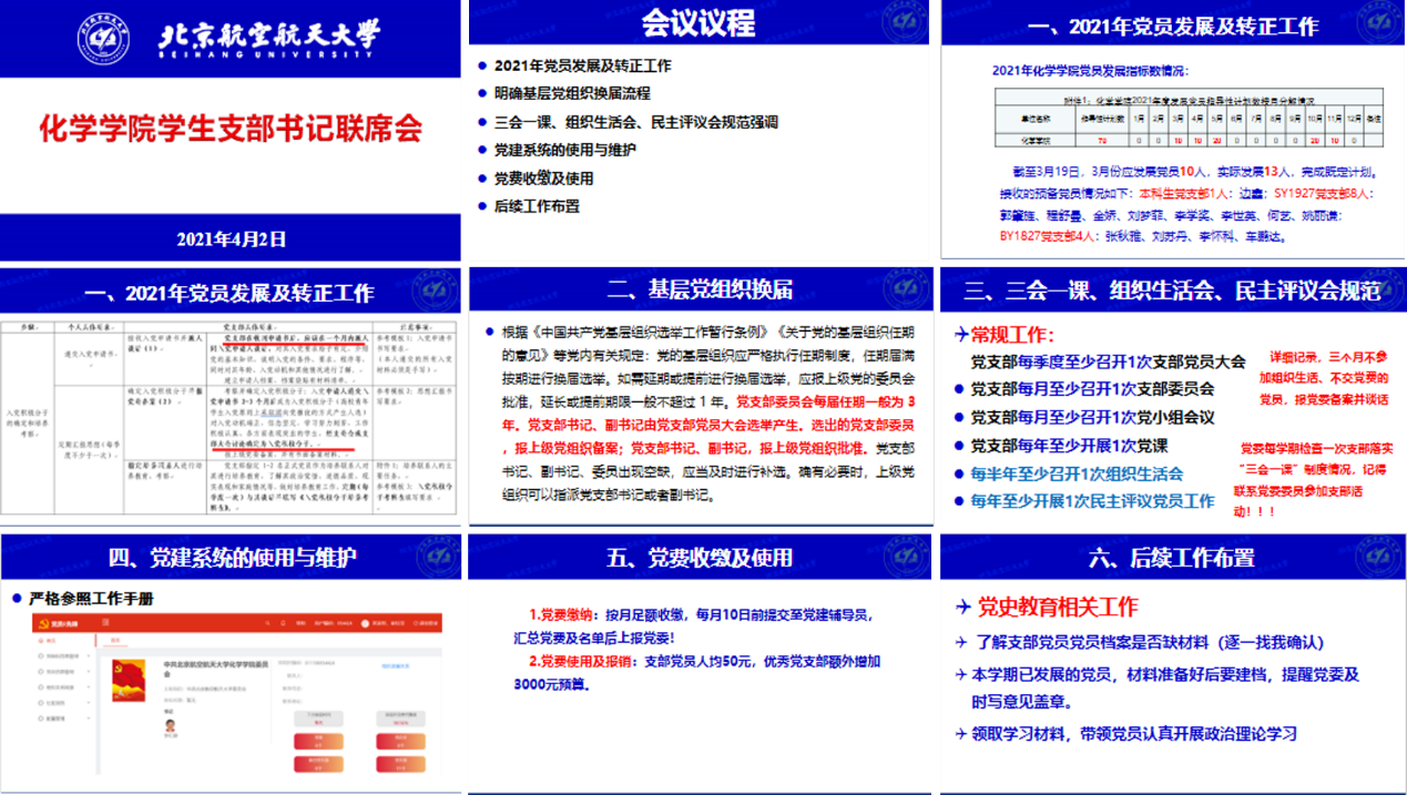 她强调,今年是建党一百周年,要把庆祝建党一百周年作为党建工作主线,并要求各学生党支部能够积极配合、及时跟进学院党委的工作安排,落实好学校对党史学习教育的各项要求,同时各支部书记还要落实“三会一课”制度以及加强自学能力。