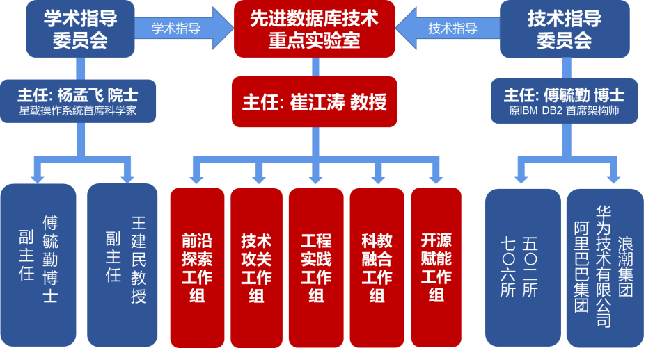 团队2019年成立“先进数据库技术”实验室,2020年与浪潮公司签署战略合作协议并成立“西电-浪潮数据库创新实验室”。实验室创新组织架构,设立“学术指导委员会”与“技术指导委员会”。学术指导委员会每年举行一次委员会会议,审定实验室研究方向与研究进展,提出战略咨询建议。实验室聘请企业知名专家作为华山学者讲座教授,受聘技术指导委员会,每个季度对实验室技术研发进展和核心技术攻关情况进行指导。实验室下设“前沿探索”、“技术攻关”、“工程实践”、“科教融合”和“开源赋能”五个工作组,探索了一条有组织科研的新路径。