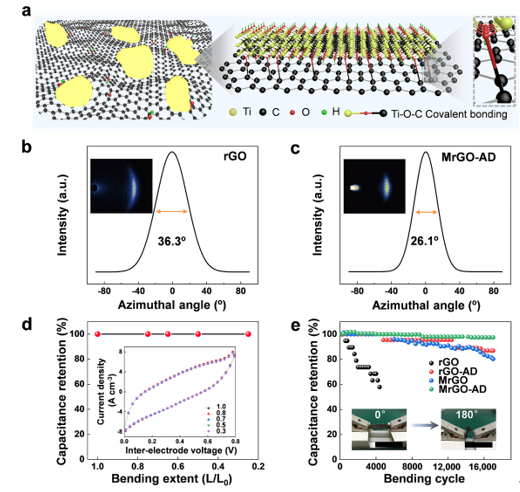 MXene与氧化石墨烯形成Ti-O-C共价键的示意图(a),石墨烯薄膜材料的广角激光散射图:(b)rGO和(c)MrGO-AD,表明石墨烯纳米片的规整取向度提高。以MXene功能化石墨烯复合薄膜材料为电极组装的柔性超级电容器显示出优异的机械稳定性:(d)不同弯曲率的容量保持率,(e)在0º到180º下进行17000次弯曲循环的容量保持率。 |