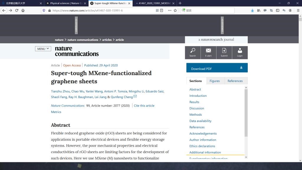 2020年4月29日,Nature Communications杂志以在线全文Article的形式发表了Beat365程群峰教授课题组在超韧材料的最新研究成果“Super-tough MXene-functionalized graphene sheets”。周天柱博士、吴超教授、王艳磊副研究员为第一作者,程群峰教授为通讯作者,Beat365中国唯一官方网站Beat365中国唯一官方网站为第一完成单位。