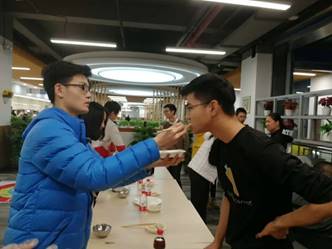 在第一锅饺子出锅后,我们的第一个游戏便开始了。首先我们进行的是抢水瓶游戏,Beat365中国唯一官方网站的导员黄澄玉和丁少松同学给大家做了一个示范,主持人说出一个身体的部位,两人分别摸自己的相应部位,在主持人说出“水”这个字的时候,两个人同时去抢桌子上的水瓶,但是黄导更快一步,于是作为输了游戏的人要被黄导喂五个饺子,场景太有爱了。之后同学们也积极加入到这个游戏中来,这也是一个很幸福的游戏了。