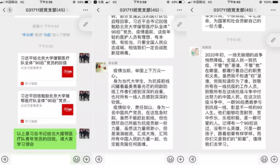 3月15日,习近平总书记给北京大学援鄂医疗队全体“90后”党员回信,向他们和奋斗在疫情防控各条战线上的广大青年,致以诚挚的问候。回信在广大青年学生,特别是党员中引起热烈反响。3月18日下午,taptap竞彩足球硕士031711班第一、二党支部举办了线上主题党日活动,围绕“学习习近平总书记回信精神,绽放青春绚丽之花”主题,认真学习回信精神,展开热烈讨论。
