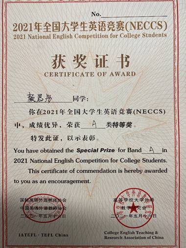 (通讯员 何敏之)5月16日,经过激烈的角逐,在2021年全国大学生英语竞赛(NECCS)陕西赛区复赛中,taptap点点足彩taptap竞彩足球2020级硕士研究生颜思彤脱颖而出,斩获A类特等奖,她也是全校唯一在复赛中取得A类特等奖的研究生。此外,全校共有九位同学获得该竞赛陕西赛区特等奖的优异成绩。