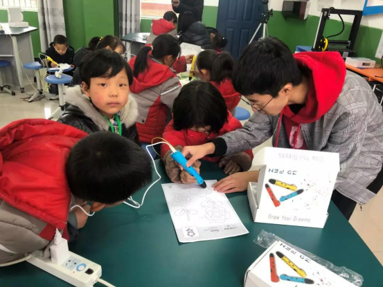 上午10点,蒲城县兴镇中心小学科创小屋科技兴趣培养课再次开讲。在taptap竞彩足球团委老师及蓝精灵志愿者同学们的指导下,小学低年级小学生们首次接触MATA机器人和3D打印笔。同学们通过对机器人进行简单编程使其完成音乐播放和按指令运动的功能。当机器人播放出悦耳的旋律以及按照规划路线绘制出相应图案时,小学生们不由自主的发出阵阵赞叹。小学生们还学习了如何使用3D打印笔。看到自己画出来的房子、火箭、自行车等图案可以直接变成实物时,小学生们纷纷感叹“这个3D打印笔也太神奇啦”。课间学院师生与小学生们积极互动,课堂气氛活跃高涨。