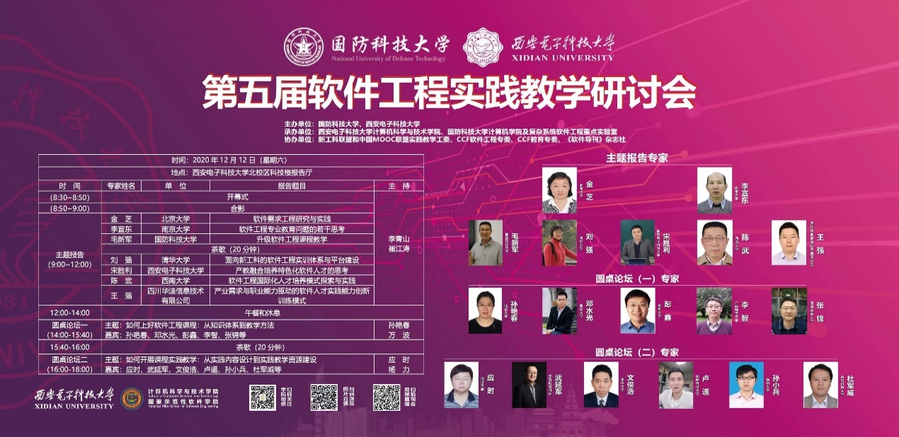 (通讯员 徐悦甡)面向新时代软件人才培养需求,进一步提高软件人才培养质量,解决软件工程专业建设和发展中的问题,2020年12月12日,在taptap点点足彩成功举办了第五届软件工程实践教学研讨会。本次研讨会由国防科技大学、taptap点点足彩主办,taptap点点足彩taptap竞彩足球(国家示范性软件学院)、国防科技大学计算机学院及复杂系统软件工程重点实验室联合承办,由taptap点点足彩taptap竞彩足球党委书记、软件工程学科负责人李青山教授与国防科技大学复杂系统软件工程重点实验室副主任毛新军教授担任会议联合主席。