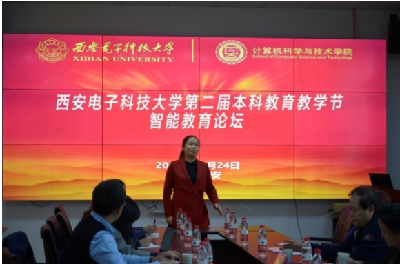 面对一流大学、一流学科、一流专业下“培养一流人才”的新挑战,苗启广教授结合他在专业领域的研究成果和从事教学管理工作的经验与思考,给大家做了“强基固本,智教融合”的专题报告,与参会者共同探讨了如何进一步加强基础理论教育、如何以学生为中心,突出个性化发展,培养学生的创新性思维、如何结合人工智能技术,将智能技术与教师智慧相结合,做到AI+HCI教学相融合,面向产出导向,提升学生培养质量等。论坛报告会结束后,仍有部分教师和苗启广教授一同围绕智能教育话题深度交流。
