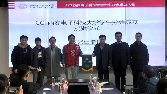 随后,周兴社教授为CCF西电学生分会指导委员会督导主任苗启广教授、分会首届主席及执委会成员颁发聘书,并进行了授旗仪式。当选主席李超能带领执委成员接旗宣誓,并做主题发言,发言中当任主席对未来一年的工作计划做了充分设想,并表达了依托CCF平台和资源建设具有西电特色的学生分会的决心和信心。学生会员辛文天代表CCF广大学生会员表达了同学们的心声以及响应CCF学术活动的积极心态。