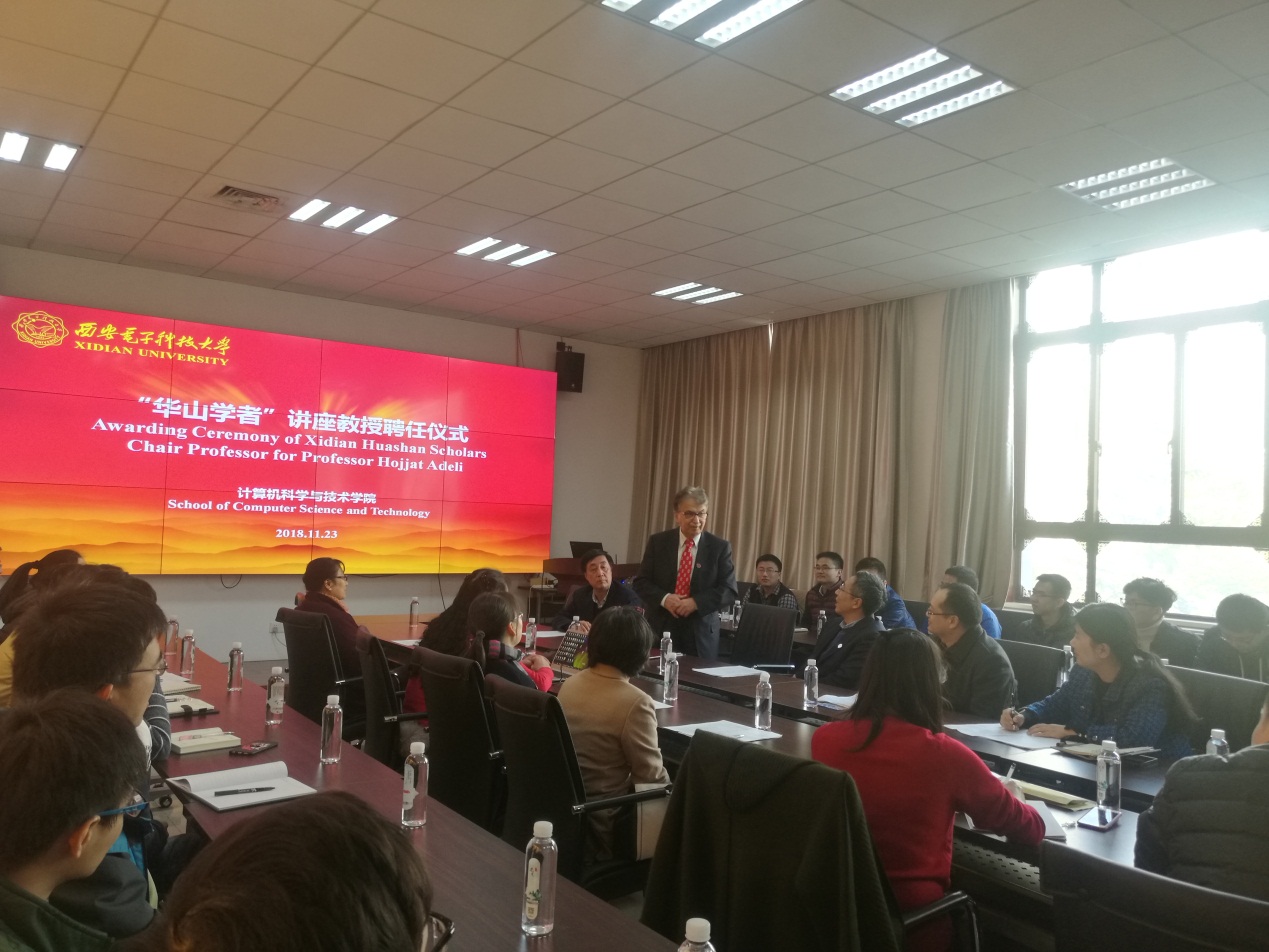 11月23日下午,Hojjat Adeli教授的“华山学者”讲座教授聘任仪式在北校区主楼Ⅱ区319报告厅举行。taptap点点足彩副校长李建东教授出席聘任仪式,国际合作与交流部国际教育处副处长孔难难、taptap竞彩足球副院长赵韩强、王宇平教授等学院师生代表参加了聘任仪式。聘任仪式由taptap竞彩足球副院长赵韩强主持。