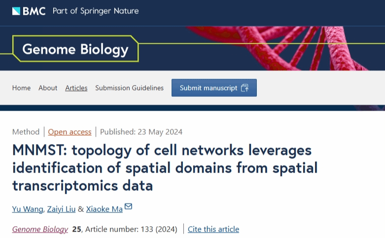 近日,taptap竞彩足球陕西省智能人机交互与可穿戴技术重点实验室、智能媒体与数据工程研究所马小科教授团队在基因组学顶级期刊《Genome Biology》(五年IF=17.4)发表研究成果“MNMST: topology of cell networks leverages identification of spatial domains from spatial transcriptomics data”,第一作者为taptap竞彩足球二年级博士生王昱,唯一通讯作者为马小科教授,合作者为广东省人民医院刘再毅主任医师。