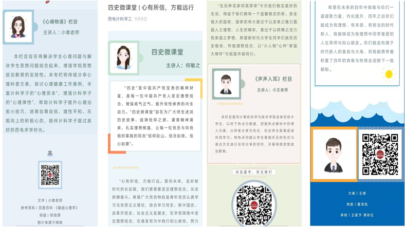 积极开拓网络思政育人阵地,推出精品网络栏目品牌。西电计科学工微信公众号在深化理论学习、推进四史教育、追踪思政热点、反映大学生活、学院工作动态、树立青春楷模等方面发挥作用。通过微信公众号、线上直播、周点名等方式持续开展网络思政、心理健康教育,视频、漫画、推文多种方式受到学生欢迎。疫情期间学院扎实组织开学“云”点名工作,被陕西省教育厅官网报道。结合疫情防控部署,围绕形势与政策热点,先后开展了“共上一堂思政大课”,学习两会精神、“我们都是收信人”、“心向阳光,青年有担当”抗疫英雄事迹分享会等活动。开设时政热点专栏《声声入耳》、四史教育专栏《四史微课堂》、心理育人专栏《心晴物语》、价值引领专栏《师说新语》、引导大学生读原文悟原理《初心诵》有声栏目,树立身边榜样的《计科学子》栏目等。推出“计科成长学堂”栏目,设“学科竞赛指导系列”、“学涯与职业发展规划指导系列”和“专业教育系列”,邀请专家为学生答疑解惑。