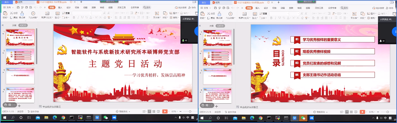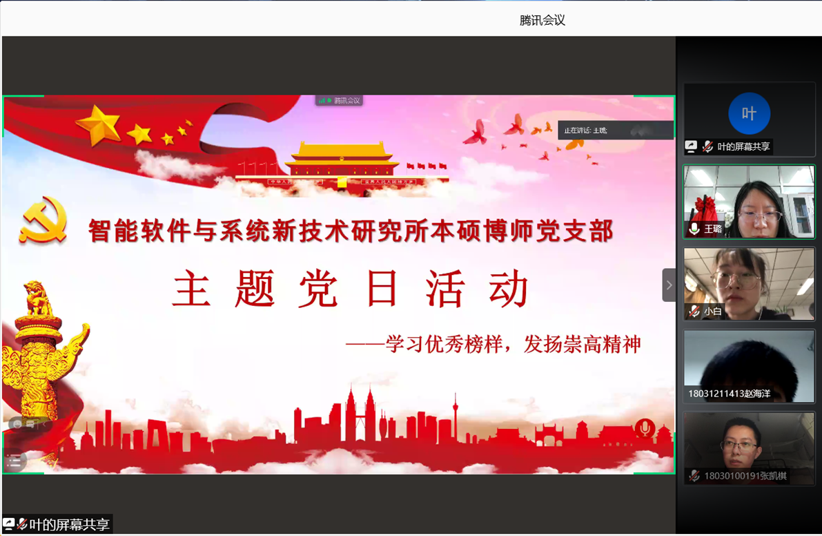 (通讯员 张凯琪)为了深入贯彻习近平总书记关于学习老一辈工作楷模、传承“五老”精神的重要指示,学习和发扬老一辈优秀榜样的崇高精神,taptap竞彩足球智能软件与系统新技术研究所本硕博师联合党支部于2020年11月27日下午开展了“学习优秀榜样,发扬崇高精神”主题党日活动。活动由支部青年委员叶国强同志主持,共计47人参加,采用腾讯会议线上召开的方式进行。