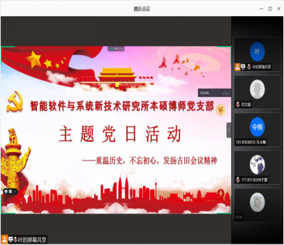 (通讯员 张恒运)为庆祝中国共产党建党100周年,深入学习贯彻习近平总书记在党史学习教育动员大会上的重要指示精神,从党的非凡历程和实践中汲取初心使命的力量,taptap竞彩足球智能软件与系统新技术研究所本硕博师联合党支部于2021年5月28日下午开展了“重温党史,不忘初心,发扬古田会议精神”主题党日活动。活动由支部副书记吕文琪同志主持,共计56人参加,会议以线上和线下的方式进行展开。
