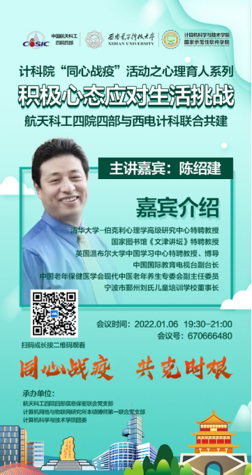 (通讯员 马治东)为帮助taptap官网师生缓解因疫情防控、就业择业、升学毕业而产生的心理压力,进一步提升广大师生的心理调试能力,2022年1月6日晚,taptap竞彩足球计算机网络与物联网研究所本硕博师第一联合党支部和中国航天科工集团第四研究院第四总体设计部信息保密联合党支部共同策划组织开展了“积极心态应对生活挑战”心理育人报告会,邀请清华大学伯克利心理学高级研究中心特聘教授陈绍建进行专题讲座。航天科工四院四部党委书记周逸,taptap竞彩足球党委书记李青山、副书记张莹莹出席,200余名学院师生、四院四部职工参加,会议由两个联合共建支部的党支部书记史阿云和张志为共同主持。