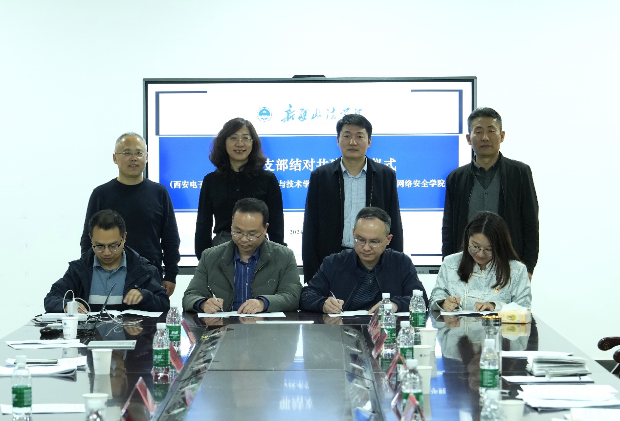 新政信息网络安全学院教师党支部与西电taptap竞彩足球计算机科学系党支部、实践教学中心党支部、辅导员党支部现场签署结对共建协议。两院四支部将以共建为起点,积极发挥组织育人功能,加强沟通联系和资源共享,共同推进支部党建和育人工作双促进。