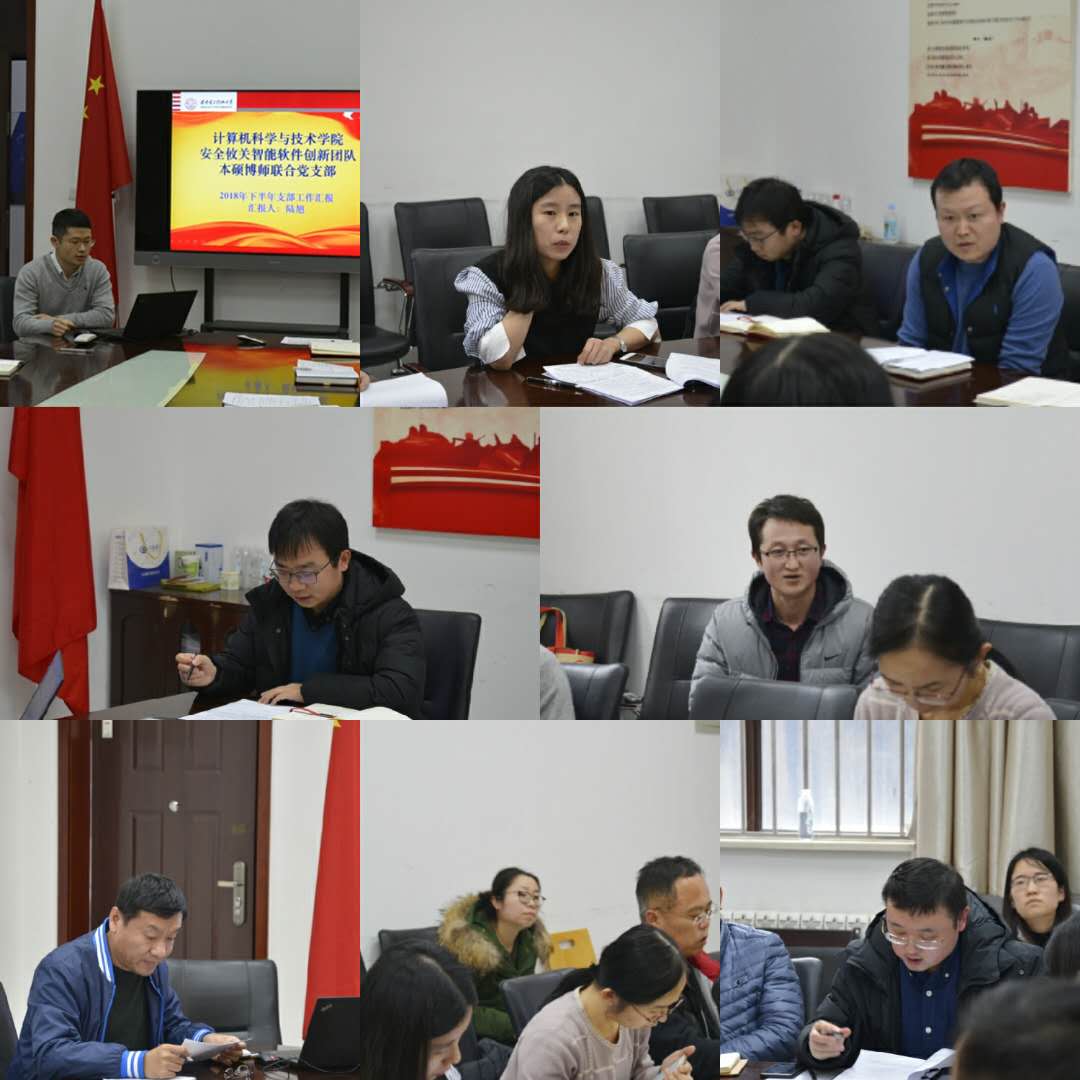 本硕博师支部的8位支部书记以“本硕博师贯通培养”的支部设置理念为思路,从党员构成、活动开展、党员发展等方面总结了2018年下半年支部工作,在认真查摆问题的基础上对2019年上半年工作思路和措施进行了汇报。安全攸关智能软件创新团队本硕博师联合支部书记陆旭同志谈到,随着支部博士生相继毕业,及时吸纳优秀学生加入支部是后续工作重点之一。软件系统工程省部级重点实验室本硕博师联合支部书记蔺一帅、计算机科学系本硕博师联合支部书记王炳波同志均认为,支部仍需进一步深入思考和不断实践,凝练本硕博师支部特色。陕西省网络与系统安全重点实验室本硕博师联合支部书记沈博同志说到,为吸引更多非党员同学加入支部,支委应提前谋划活动内容、创新活动形式。输入输出设备省部级重点实验室本硕博师联合支部罗楠同志针对党建与业务结合不够紧密的问题,在工作计划中按月设计了理论学习、支部研讨、主题实践等内容,以业务促党建、以党建抓业务。西安市大数据与视觉智能关键技术重点实验室本硕博师联合支部书记刘向增同志、计算机工程系本硕博师联合支部书记张琛同志均提到了支部联合开展主题活动的计划。软件工程系支部书记李瑞同志从实现党员社会价值的角度详细介绍了校企支部互动互学的思路。