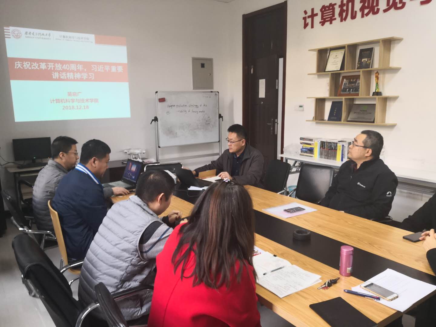 (通讯员 王琨)12月18日上午,庆祝改革开放40周年大会隆重召开。中共中央总书记、国家主席、中央军委主席习近平出席大会并发表重要讲话。当天下午,taptap竞彩足球网络工程系党支部在主楼四区225开展了学习“习近平在庆祝改革开放40周年大会上的重要讲话”主题党日活动。本次活动由支部书记苗启广教授主持,支部党员参加学习。