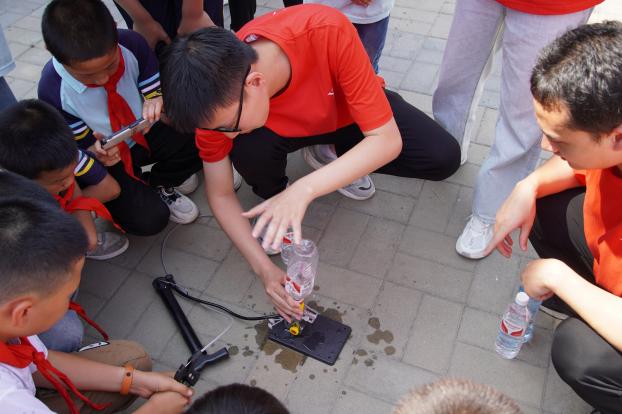 “小朋友们,大家知道什么是斯特林发动机吗?”面对大家的好奇,软件工程专业李佳乐向小朋友们展示了斯特林发动机的工作过程,结合近期国产汽车品牌热门话题,用生动活泼的语言向大家介绍了各种发动机的组成与工作原理,包括内燃机外燃机的区别、燃气冲压发动机以及新能源汽车的电机等。理论课结束后,团学骨干们与小朋友一起分为三组,共同完成“水火箭”的拼装与发射。“哇!火箭发射的好高!好好玩呀!”在一片欢声笑语中结束了此次社区实践公开课。
