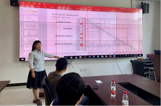 在报告中,蔡教授将经济学理论与软件健康管理相融合,详细介绍了以数据为中心的软件健康管理分析模型、DL软件质量指标、可支持软件质量分析的工具集DV8在工业项目中的工程应用案例等。同时,结合报告具体内容,蔡教授还为在场师生分享了自己在美国Drexel大学讲授《软件体系架构》和《软件设计模式》课程中的教学趣事和美国学生在软件架构学习中遇到的各种问题。在一个多小时的报告里,蔡教授以真实的软件系统数据为引导,将自己在软件体系架构领域最新的研究成果分享给与会师生,让与会师生对软件架构、软件质量管理的学术前沿有了更深入的认识和思考。在讨论交流环节,与会师生基于蔡教授分享的内容开展了热烈的讨论和交流,蔡教授针对与会师生所提出的问题也给予了认真而细致的解答。