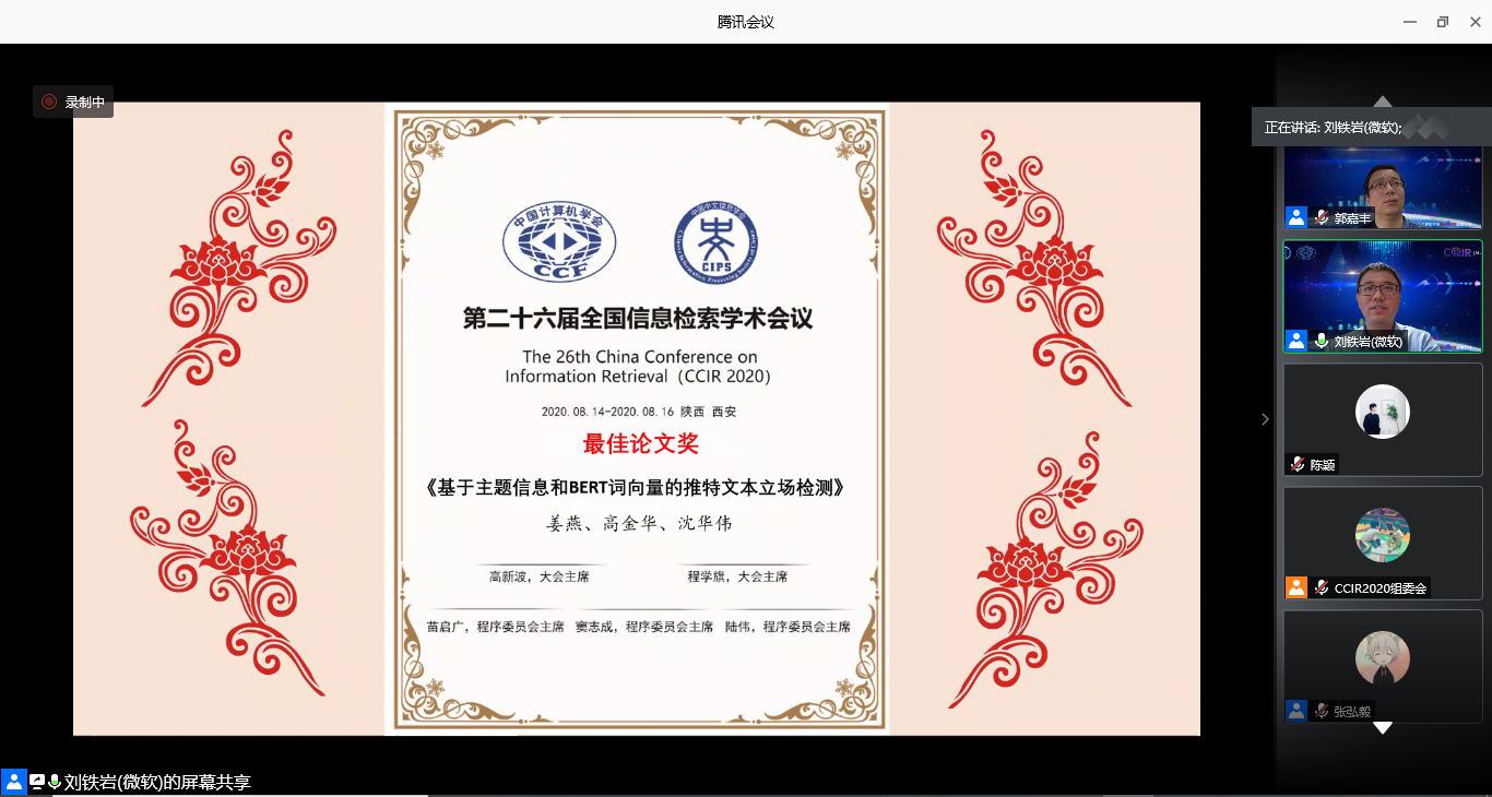 (通讯员 王丹 陈颖)2020年8月14日至16日,第二十六届全国信息检索学术会议(The 26th China Conference on Information Retrieval,简称CCIR2020)在互联网线上顺利召开。会议由中国计算机学会(CCF)和中国中文信息学会(CIPS)联合主办,taptap点点足彩承办,并得到了微软(中国)有限公司、中国人民大学高瓴人工智能学院、百度公司的赞助支持。本次会议邀请清华大学、中国人民大学等多个国内知名高校,搜狗公司、微软亚洲研究院等多个知名企业,来自全国从事信息检索理论与应用研究的50多所高校和科研机构共230余人参加了会议。