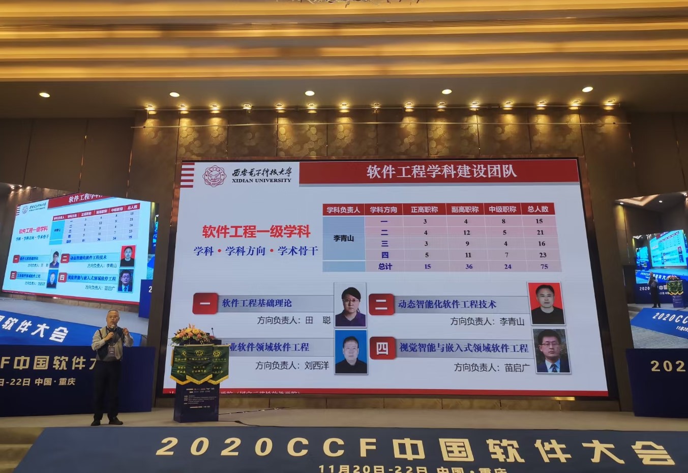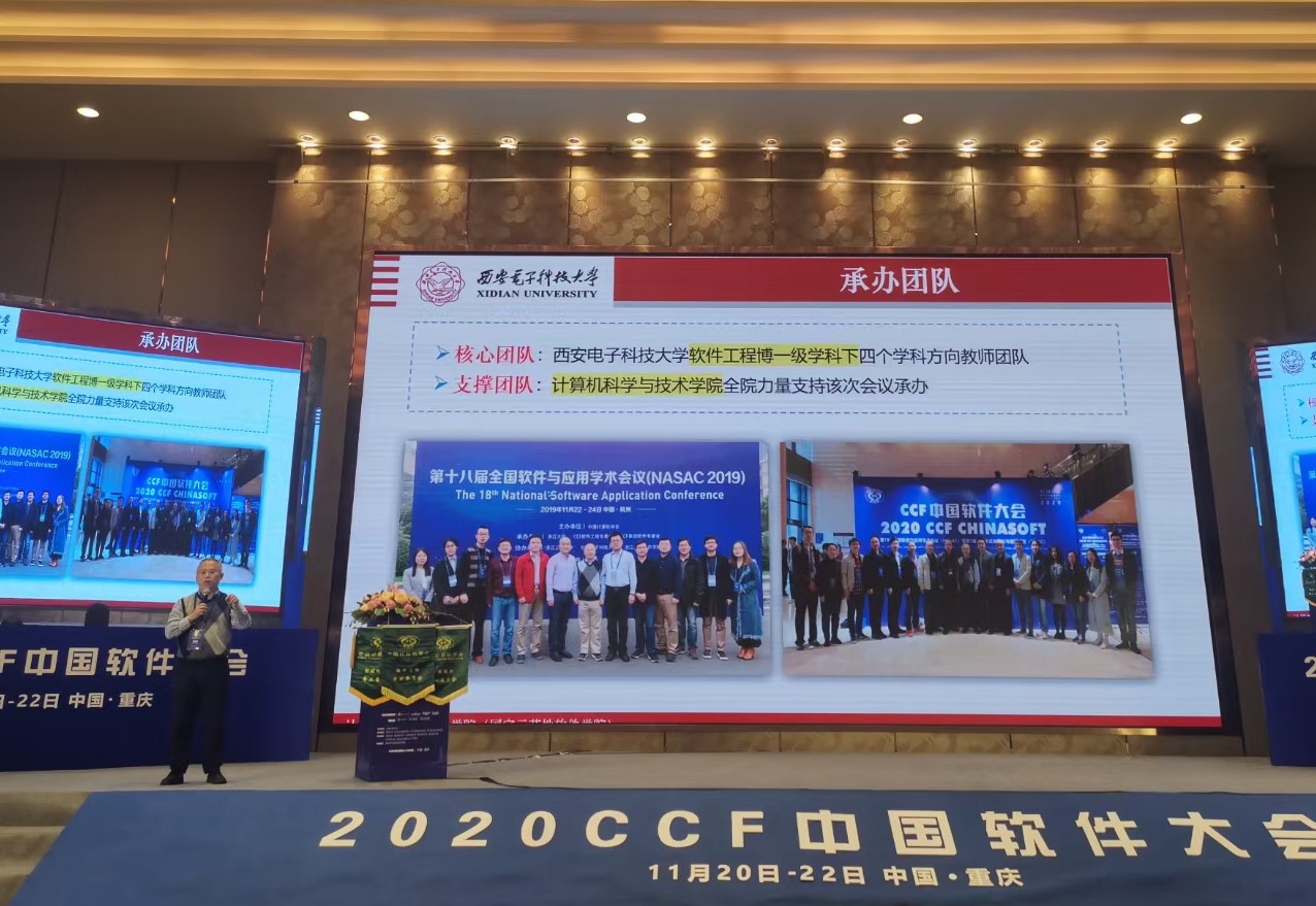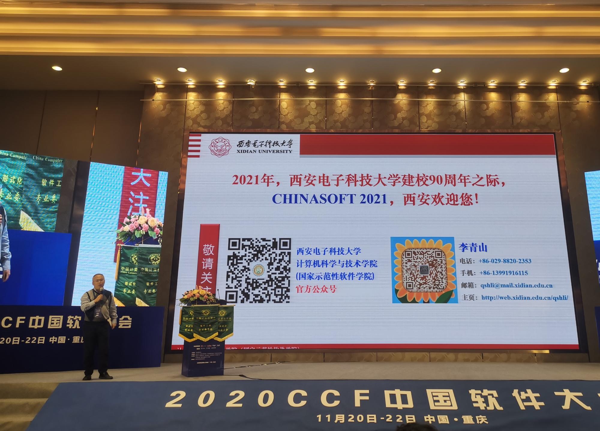 (通讯员 徐悦甡)2020年11月20日至11月22日,CCF中国软件大会(CHINASOFT)在重庆召开,会议由中国计算机学会(CCF)主办,CCF系统软件专业委员会、CCF软件工程专业委员会、CCF形式化方法专业委员会、重庆大学大数据与软件学院承办。taptap点点足彩软件工程学科四个学科方向的骨干教师20余人及部分学生,在学科负责人李青山教授、学科方向负责人田聪教授、刘西洋教授、苗启广教授以及学科秘书长宋胜利教授的带领下参加了会议。学科参会教师和学生有多篇论文被录用并被推荐到《软件学报》等知名期刊,参会教师和学生还在大会举办的教学与学科竞赛中获得佳绩。特别地,taptap官网获批了明年CCF中国软件大会的承办权,李青山参加了下届会议的承办交接仪式。
