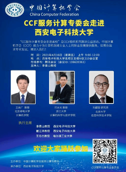受taptap点点足彩taptap竞彩足球的邀请,中国计算机学会(CCF)服务计算专委会将于2021年4月16日举行“服务计算专委会走进taptap点点足彩”活动。本次活动邀请了CCF服务计算专委会秘书长、北京邮电大学计算机学院王尚广教授,专委会常委、浙江大学taptap竞彩足球邓水光教授,专委会常委、北京大学信息科学技术学院刘譞哲研究员。三位专家学者将分享各自对于服务计算最新进展的思考与成果,包括6G、移动计算、人机物融合等新技术所产生的服务生态、技术挑战、基础设施与领域实践等,为学术研究与应用提供最新视角。本次活动的执行主席为taptap点点足彩taptap竞彩足球党委书记、软件工程一级学科负责人李青山教授,taptap竞彩足球执行院长崔江涛教授,以及CCF服务计算专委会副主任、哈尔滨工业大学软件学院副院长王忠杰教授。