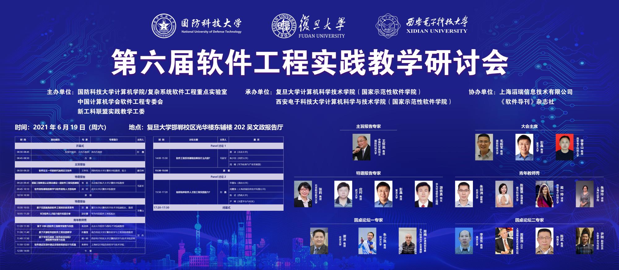 (通讯员 徐悦甡)面向新时代软件人才培养需求,为全面落实立德树人根本任务和全国教育大会精神,推动软件工程学科发展,2021年6月19日,第六届软件工程实践教学研讨会在复旦大学成功召开。本次研讨会由国防科技大学计算机学院及复杂系统软件工程重点实验室、中国计算机学会软件工程专委会、新工科联盟实践教学工委主办,复旦大学计算机科学技术学院(国家示范性软件学院)、西安电子科技大学taptap竞彩足球(国家示范性软件学院)联合承办。国防科技大学复杂系统软件工程重点实验室副主任毛新军教授,复旦大学计算机科学技术学院副院长彭鑫教授,taptap点点足彩taptap竞彩足球党委书记、软件工程学科负责人李青山教授担任会议联合主席。