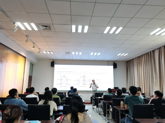 林学民教授做了题为《Subgraph Matching : Past and Present(子图匹配:过去与现在)》的报告。图数据是大数据的关键组成部分,在许多应用中被广泛使用。目前,在图数据的管理和分析领域,已经有许多的研究工作产出,致力于解决许多基础研究问题。林教授在报告中,聚焦子图匹配问题,历数近十年的解决方案,包括单机方案和分布式方案。报告最后,林教授与现场师生热烈互动,共同探讨科研问题。