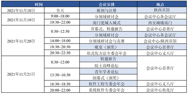 2021CCF中国软件大会将组织特邀报告、院士高峰论坛、青年学者论坛、论文专刊论坛、顶会顶刊论坛、学术论坛、工业论坛、教育论坛、学科竞赛答辩和软件研究成果展示等30余个不同类型的活动。大会将邀请10余位软件及相关领域中国科学院院士与中国工程院院士,为大会带来特邀报告并参加院士高峰论坛等活动。目前已邀请参会的两院院士包括中国科学院院士林惠民,中国科学院院士陶文铨,中国科学院院士梅宏,中国科学院院士吕建,中国科学院院士李应红,中国工程院院士廖湘科,中国科学院院士杨孟飞,中国科学院院士管晓宏,中国科学院院士王怀民,中国科学院院士冯登国,中国工程院院士孙凝晖等。