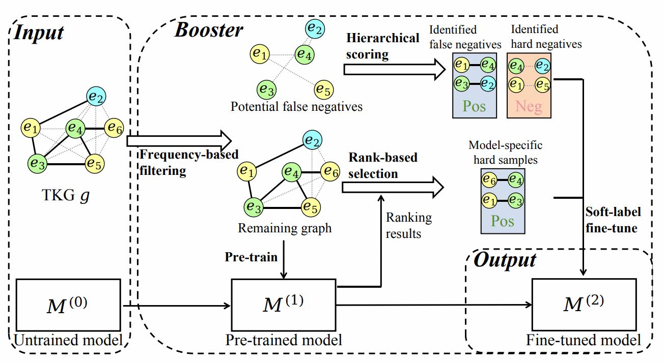 团队张嘉昇博士为第一作者的论文《Towards Pattern-aware Data Augmentation for Temporal Knowledge Graph Completion》由其合作者梁爽博士代为介绍。时序知识图谱缺失事实预测是支持高质量知识决策的一项关键基础任务。该任务面临的主要挑战在于数据分布的不均衡,即知识在时间与空间维度上分布不均匀。该论文提出了首个面向时序知识图谱的数据增强框架—Booster。该框架的核心目标,是生成符合时序知识图谱中复杂语义与时序模式的新样本,并识别出特定模型难以学习的样本。Booster能够无缝集成到现有时序知识图谱预测模型中,在五个大规模基准数据集上平均实现了4.5%的性能提升,验证了其有效性与通用性。