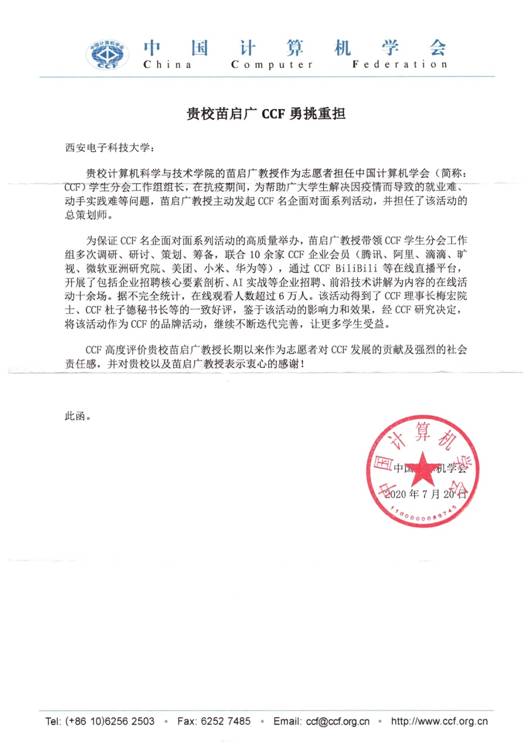 感谢信指出,苗启广教授带领CCF学生分会工作组多次调研、研讨、策划、筹备,联合腾讯、阿里、微软亚洲研究院、滴滴、字节跳动、旷视、美团、华为等10余家CCF企业会员,通过CCF BiliBili等在线直播平台,开展了包括企业招聘核心要素剖析、AI实战等企业招聘、前沿技术讲解为内容的在线活动十余场,累计在线观看师生人数超过6万人,为疫情期间学生就业工作做出了重要贡献。同时,为了让更多学生受益,中国计算机学会(CCF)研究决定将该活动作为CCF品牌活动,持续迭代完善。